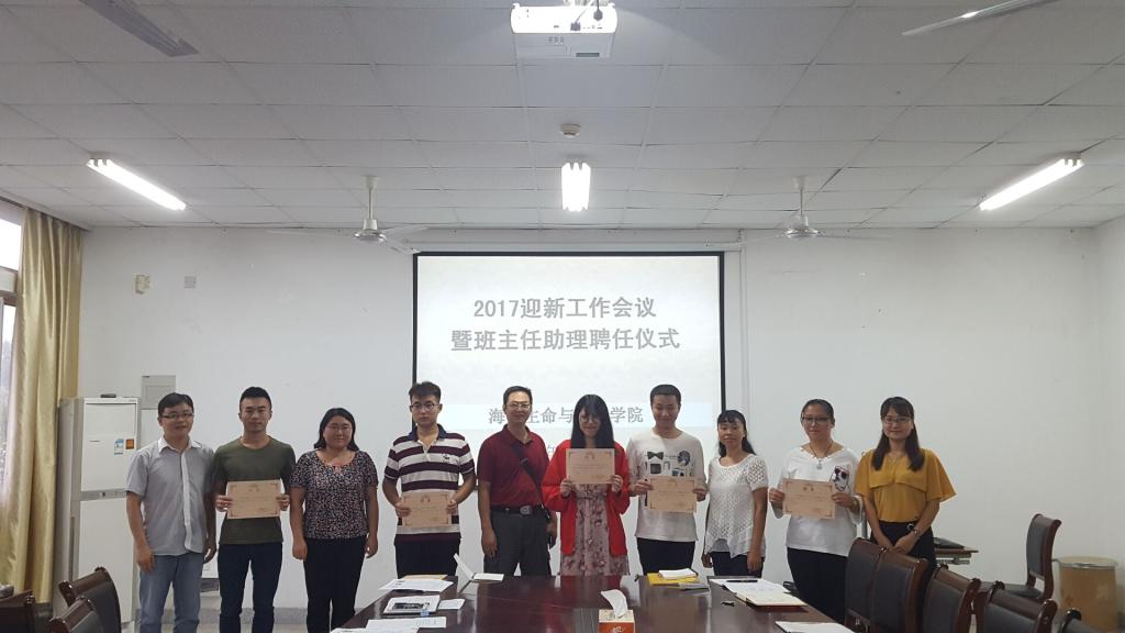 9月6日下午,海洋生命与水产公司在海洋南楼202会议室举行2017级新生班主任助理聘任仪式暨迎新工作布置会。公司党委书记王波、副书记唐瑶、2017级新生班主任、新任班主任助理、全体辅导员参加了此次会议,会议由学工办主任时树奎主持。