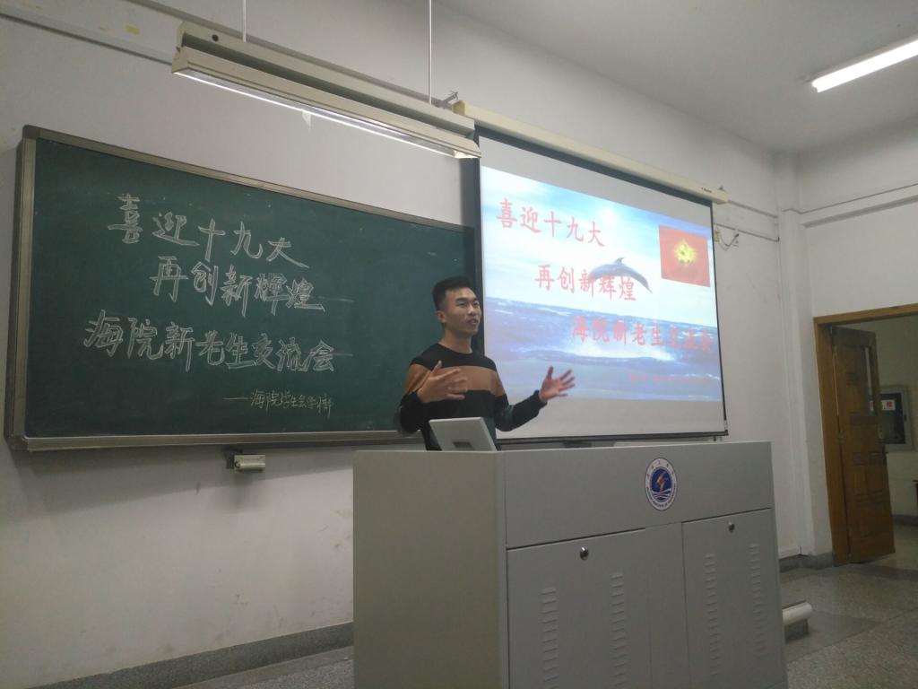10月18日,院团委在文通A楼211开展了青春故事分享会。校员工会副主席孙施乐,给新生分享自己的大学故事的同时鼓励新生们向着初心的目标努力奋斗,不忘初心,方得始终,激励和告诫新生青春就要多“折腾”,但大学的学习生活中依旧要自律,要树立自信,要积极向上。海院青年志愿者协会会长史向港则向新生们展示了丰富多彩的暑期社会实践活动,鼓励新生们多参与实践,丰富老员工活,牢记实践才是检验真理的唯一标准。生技152班的印汉学长和新生们分享了他远赴韩国留学的各种趣事,通过自己的亲身体会给同学们讲解职工活揭开了同学们最为好奇的神秘面纱;最后水产161的宋杰则简短有力,介绍水族箱造景的程序的同时用自己的切身体会告诉大家努力终究会有回报。在谈到水族箱制作的过程时,他说:“每天你们以为自己每天披星戴月,可在我们看来却不过是最令人羡慕的清闲时光。”