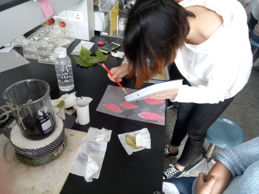 叶脉书签的制作是一个操作性简易,趣味性强的实验。比赛现场,李士虎老师详细讲解叶脉书签的制作过程及注意事项,并向大家展示优秀的叶脉书签。随后,参赛者们跃跃欲试,将选择好的叶片放在沸腾的氢氧化钠溶液中,煮好后将叶片夹出,用软毛牙刷刷去叶片中叶脉以外的部分,露出叶脉,叶脉书签制作就基本完成了。接着,大赛进入高潮,同学们发挥想象,各种新奇的样式层出不穷:有美丽的七彩蝶花中蹁跹,有穿着叶脉裙子的美人鱼妖娆多姿,更有一叶知秋的无限感慨……简单如染色叶片,繁复如百花齐放,创意如童话人物,令人眼花缭乱,目不暇接。活动现场同学们相互协作,洋溢温馨愉悦的气氛。在制作过程中指导老师们也对同学们进行耐心的教学指导,告诉他们叶脉的褶皱和叶肉剔除问题,使同学们的作品更加整齐美观。