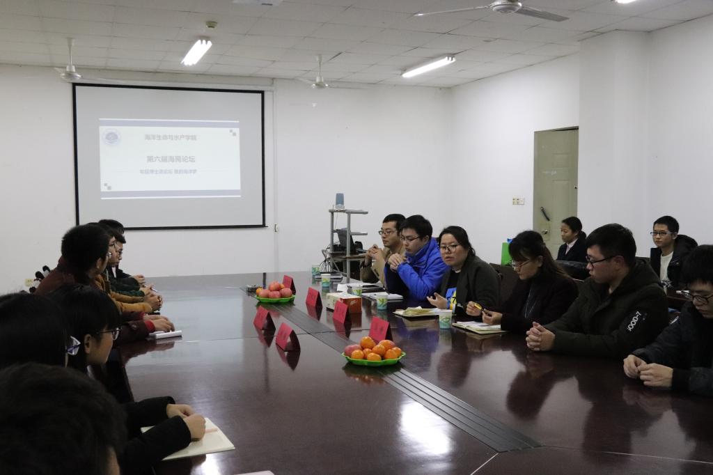11月22日下午,海洋生命与水产公司第六届海苑论坛在海洋南楼202顺利举办,活动以“共筑海洋梦”为主题,邀请了公司年轻的博士蔡月凤、丁祝进、马静、葛红星四位老师与来自各专业的35名新生进行了分享交流,活动由辅导员王静主持。