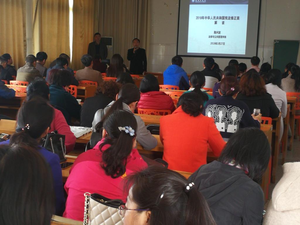 陈教授从四方面详细解读2018年全国人民代表大会通过的中华人民共和国宪法。一、新中国宪法制定和修正的历史;二、2018年宪法修正案出台的背景和过程;三、2018年宪法修正案的具体内容;四、2018年宪法修正的重要意义。陈教授的报告语言朴素、深入浅出、生动形象、系统全面、清晰明了的阐述了2018宪法修正案的来龙去脉,让全体教师对2018年我国宪法修正有了全面的理解。会后许多老师表示听完报告深受启发,感觉耳目一新。宪法是我国根本大法,是其他立法的基石,与每个人都息息相关,我们一定深刻理解和运用法律,做到遵纪守法、依法办事,为宣传、普及宪法尽一份力。