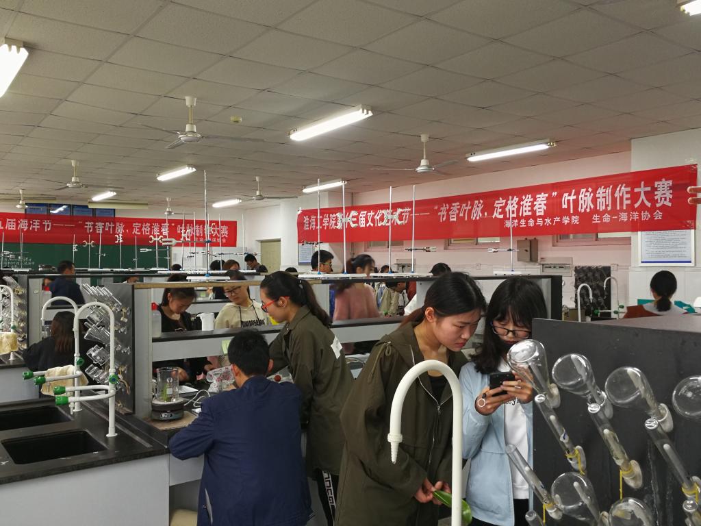 4月22日上午,由生命-海洋协会承办的校第十三届文化艺术节之“书香叶脉,定格淮春”叶脉制作大赛于海洋南楼309顺利举办。活动邀请海洋生命与水产公司实验中心李士虎老师、社团指导教师吴海龙担任评委。比赛现场热火朝天,来自8个公司的28组参赛选手团结协作,用科学和实验见证着大自然的魅力,用创新和智慧感受着淮工的美丽。