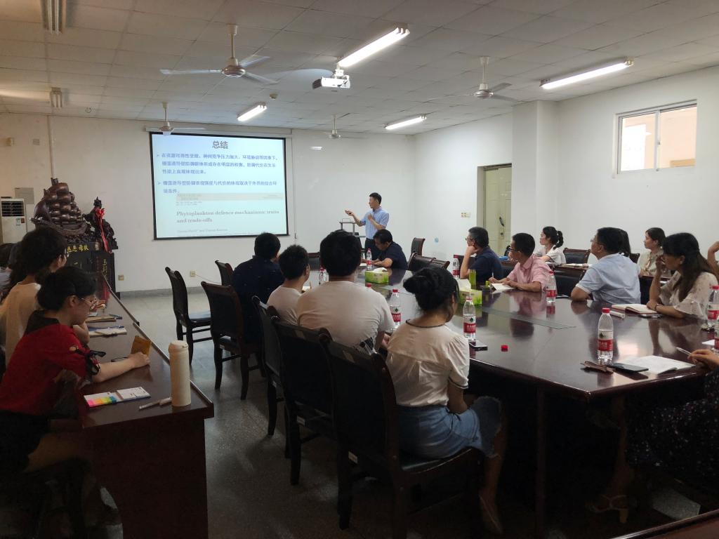 杨教授的报告中讲到在生态系统各营养级中,许多生物为了抵御较高营养级的捕食作用,在与其捕食者的长期协同进化过程中形成了多种多样的防御方式。防御方式按防御的时效性可分为诱导型防御和组成型防御。栅藻(Scenedesmus spp.)是一类具有典型诱导防御的藻类,在全球范围内的淡水水体中广泛存在。栅藻能够响应牧食者信息素,形成4细胞、8细胞甚至更多细胞的真定型群体。防御理论认为,任何形式的防御均伴随着代价的付出。栅藻形成防御群体后,由于比表面积的降低,导致“包裹效应”和较高的沉降速率,因此栅藻的诱导型防御必然伴随着代价的产生。报告从如下6各方面分别阐述,1、栅藻诱导型反牧食防御群体形成的条件;2、栅藻诱导型反牧食防御群体形成的发现;3、栅藻诱导型形成的反牧食效果(益处);4、诱导型防御对维持种群稳定性的作用;5、诱导型防御群体形成的原因分析;6、栅藻诱导型反牧食防御在资源可得性降低时的权衡策略与代价分析。本研究发现,在资源受限、竞争、环境胁迫等条件下栅藻在形成防御群体时伴随着显著的直接代价,且存在防御策略的权衡策略,本研究结果完善了栅藻诱导型反牧食防御理论,对于推动种间关系的研究也具有重要意义。