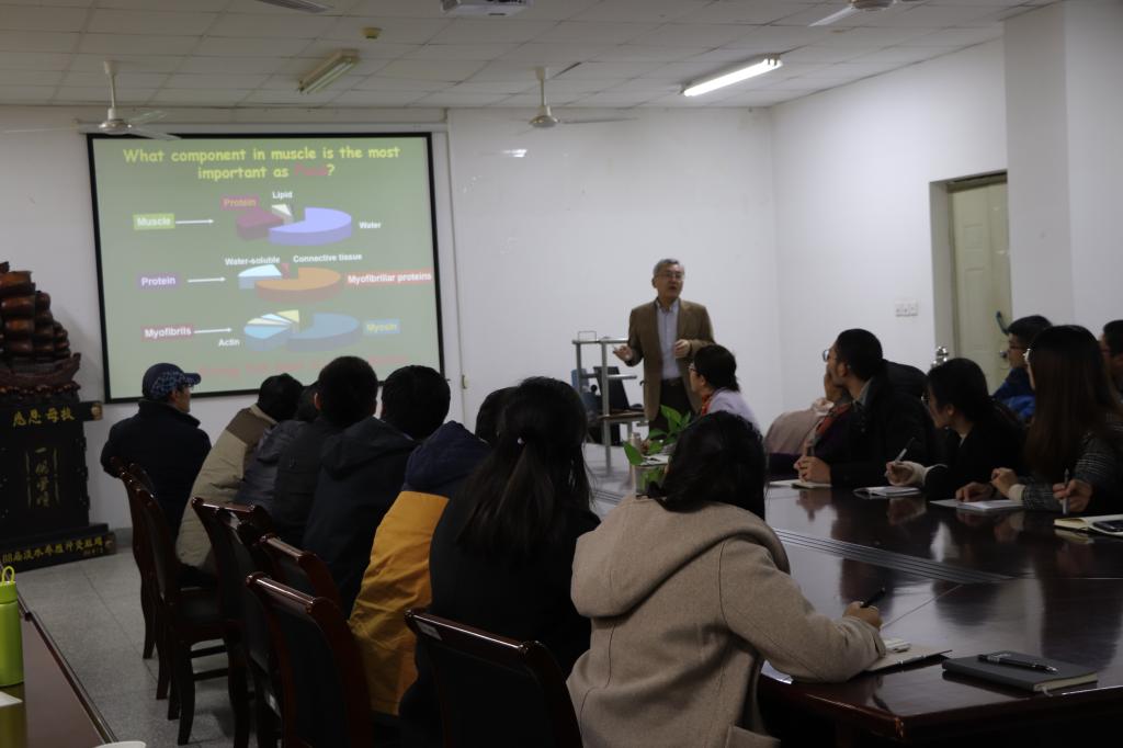 今野教授做了题为《鱼类蛋白生化特性及保鲜研究》的报告。从肌原纤维蛋白质的结构和生化特性,蛋白变性的机理及预防方法,常见淡水鱼肌肉肌球蛋白热稳定性的周期性变化,淡水鱼不同鱼种之间以及淡水鱼与海水鱼之间肌球蛋白热稳定性的差异,鱼肉保鲜领域的最新研究进展等方面做了介绍,并结合自己的研究成果,系统阐述金枪鱼保鲜的方法。