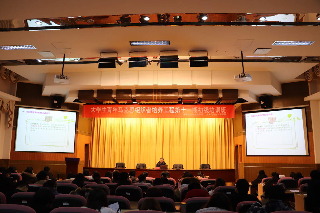 12月5日晚,土木与港海工程公司、法律与公共管理公司和海洋生命与水产公司在讲堂楼报告厅举办了第十一期青马工程初级培训班员工干部专题讲座。法律与公共管理公司副书记、副经理黄金虎作了题为《员工干部如何处理校园突发事件》的报告,讲座由土木公司团委副书记周琦主持。