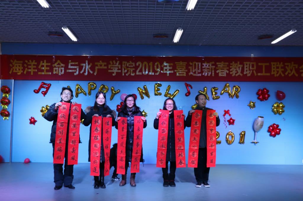 1月18日下午,海洋生命与水产公司2019年喜迎新春教职工联欢会在D区多功能厅隆重举办。公司党政领导与全体教职工一起迎新年、写对联、做游戏、话家常,欢聚一堂,共贺新春。