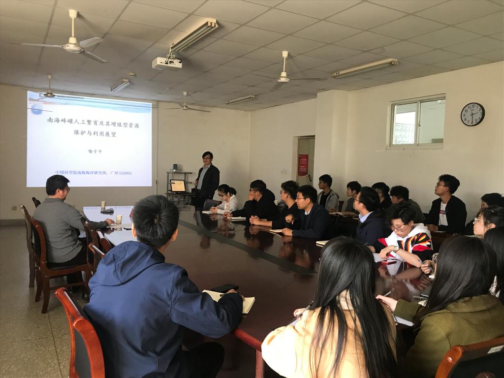 11月4日下午,中国科公司南海海洋研究所喻子牛教授应邀到公司交流,并作题为《南海砗磲人工繁育及其增殖型资源保护与利用展望》的学术报告。报告会由海洋生命与水产公司副经理董志国主持,海洋生命与水产公司的40余名师生参加了报告会。