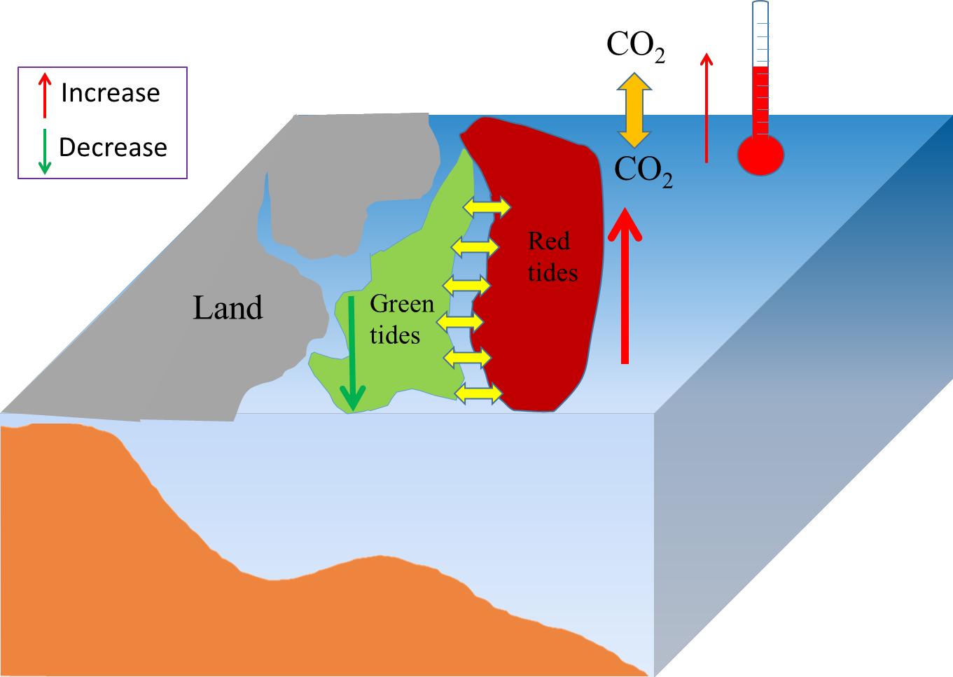 人类活动排放的CO2使得大气CO2浓度不断增加,很大程度上造成了全球升温和海洋酸化。但是有关气候变化背景下赤潮和绿潮之间如何作用与演变,我们还知之甚少。我们研究表明,酸化会缓解绿潮藻对赤潮藻的抑制效应,同时由于酸化条件下,升温对绿潮藻的负面效应以及对赤潮藻的正面效应,因此在将来海洋酸化和暖化的条件下,赤潮藻相对绿潮藻更有竞争优势。本研究为预测气候变化背景下赤潮和绿潮的相互作用和演化提供了新的视角。