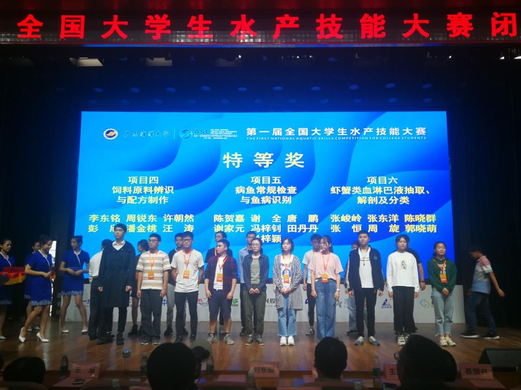 11月24日,第一届全国老员工水产技能大赛在广东海洋大学圆满落下帷幕。公司水产养殖学专业的6位同学参加比赛并取得骄人成绩,其中,锐东同学获得饲料原料辨别与配方制作项目特等奖、孙梦芹同学获得鱼类解剖与分类鉴定项目特等奖、黄永波同学获得养殖水体溶解氧检测项目一等奖、李润波同学获得浮游生物种类鉴定项目一等奖、谷昭天同学获得病鱼常规检查与鱼病识别项目一等奖,胡少秋同学获得虾蟹类血淋巴抽取、解剖及分类项目二等奖。