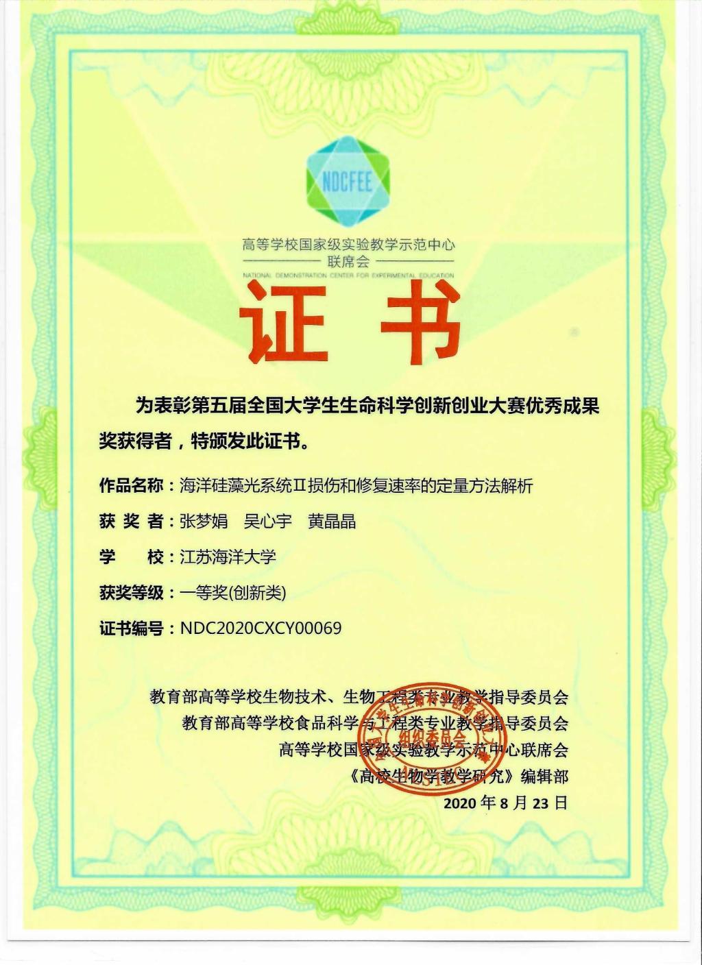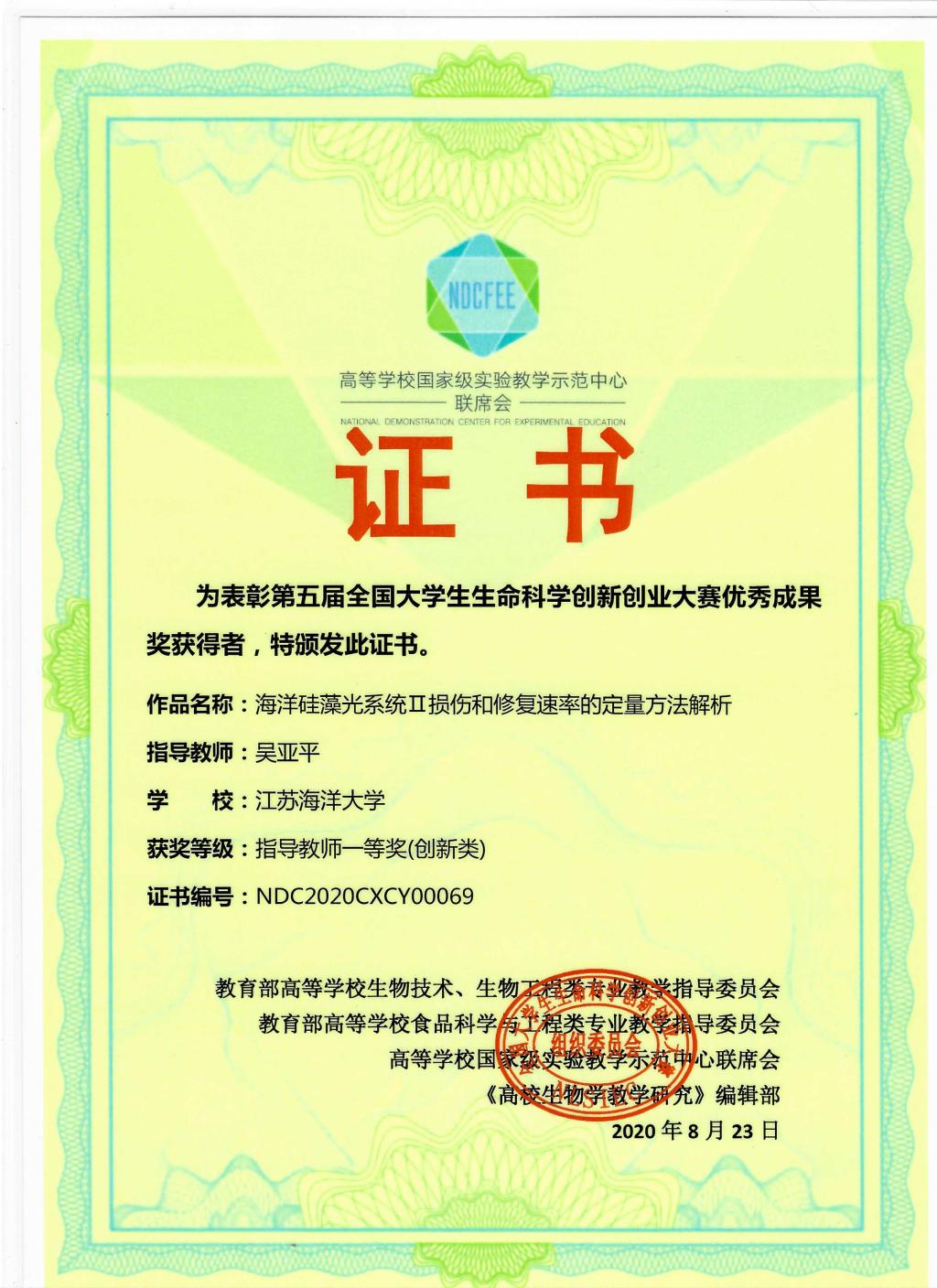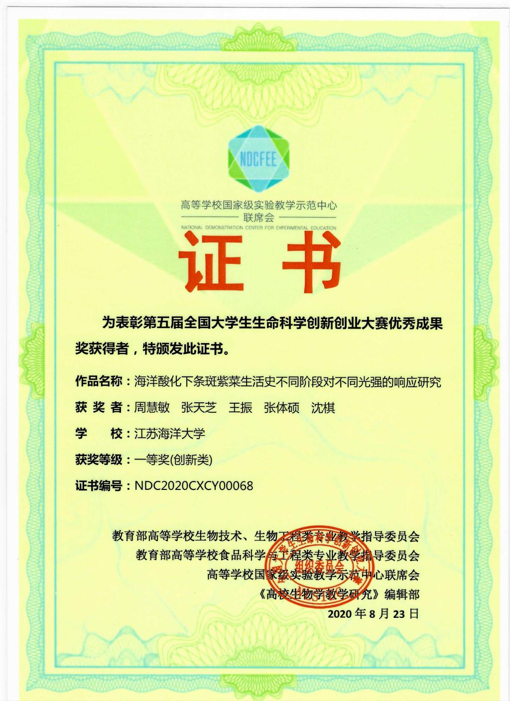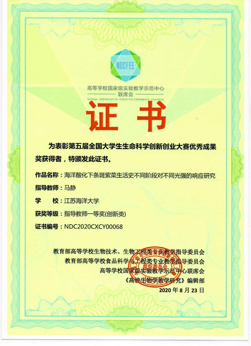 由于疫情影响,本届大赛决赛全程采用“云”答辩,在复旦大学、南京农业大学、上海交通大学、兰州大学、吉林大学、贵州师范大学等全国6个赛区、8个赛场(其中创新组6个、创业组2个)同时举行。通过评委线下集中、现场亮分,参赛队伍视频汇报、线上答辩的方式进行。公司参赛作品“海洋酸化下条斑紫菜生活史不同阶段对不同光强的响应研究”(员工:周慧敏、张天芝、张体硕、王振、沈棋,指导教师:马静)和“海洋硅藻光系统Ⅱ损伤和修复速率的定量方法解析”(员工:张梦娟、吴心宇、黄晶晶,指导教师:吴亚平)在本次大赛决赛中凭借突出的科研成绩、出色的答辩最终获得两项一等奖。
