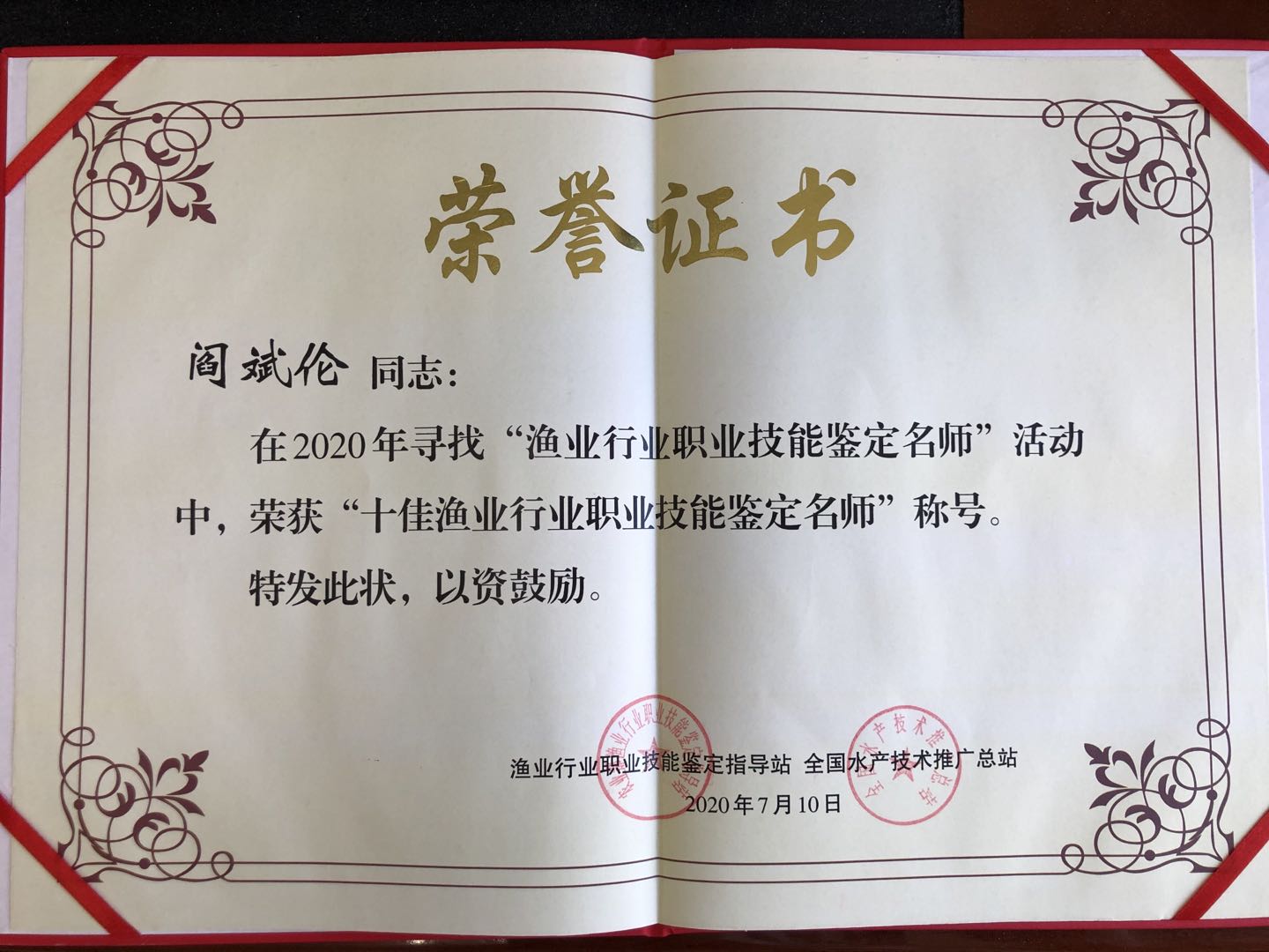 教师节来临之际,从北京传来喜讯,公司阎斌伦教授荣获首届全国“十佳渔业行业职业技能鉴定名师”称号。根据《关于开展寻找“渔业行业职业技能鉴定名师”活动的通知》(农渔技体函〔2020〕37号),农业农村部渔业行业职业技能鉴定指导站、中国水产学会、全国水产技术推广总站于今年3月启动了寻找“渔业行业职业技能鉴定名师”活动。经单位推荐、网络投票、专家评审和结果公示,产生了首届全国“十佳渔业行业职业技能鉴定名师”。近日,在中国水产学会、全国水产技术推广总站主办的2020年全国水产科技活动周启动会上向获得“十佳渔业行业职业技能鉴定名师”称号的同志颁发了证书,会议指出十佳渔业行业职业技能鉴定名师充分展现了科技工作者“研当以报效国家为己任,学必以服务人民为荣光”的精神。他们以服务乡村人才人振兴为己任,辛勤工作,开拓进取,为渔业技能人才培养和产业发展做出了贡献。希望全国渔业行业职业技能鉴定系统要以他们为榜样,为实施乡村振兴战略提供更有力的人才支撑。