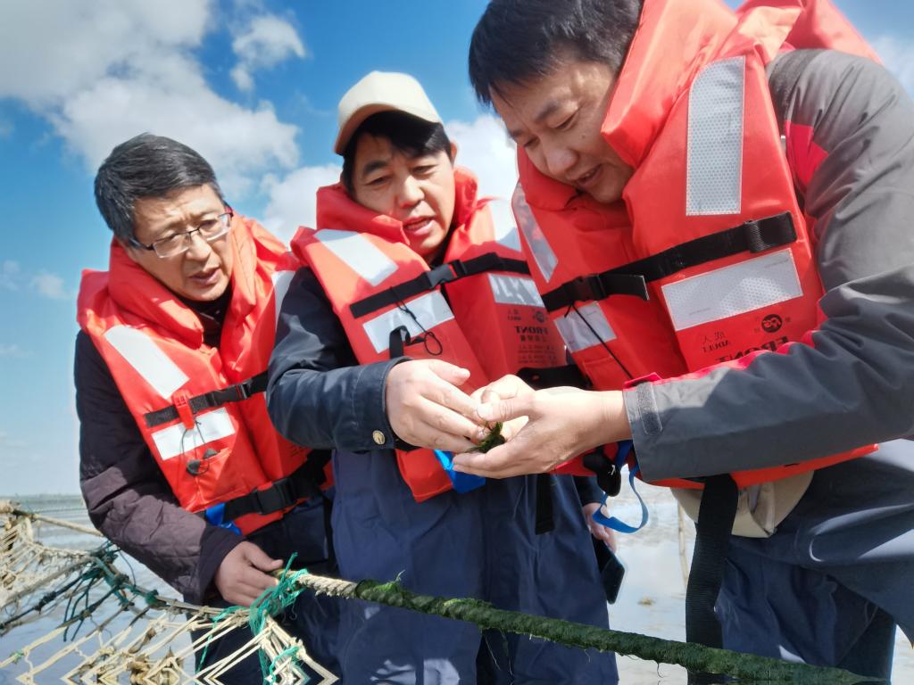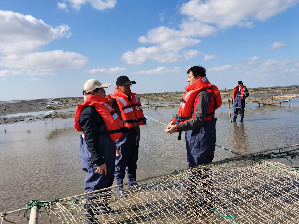 在调研过程中,徐军田经理一行仔细查看了渔禾岛紫菜新型养殖方式及条斑紫菜生长情况,详细询问了新型养殖方式的基础建设投入、优势、运行情况以及生态影响。针对养殖过程中附生藻类情况,徐军田经理与省渔业指挥部、盐城市自然资源和规划局、农业农村局的领导交流了目前最新的防控技术,并达成共识,大家一致认为需要加强相关合作研究,进一步优化紫菜生态养殖方式,为我省海洋生态环境保护提供技术支持。