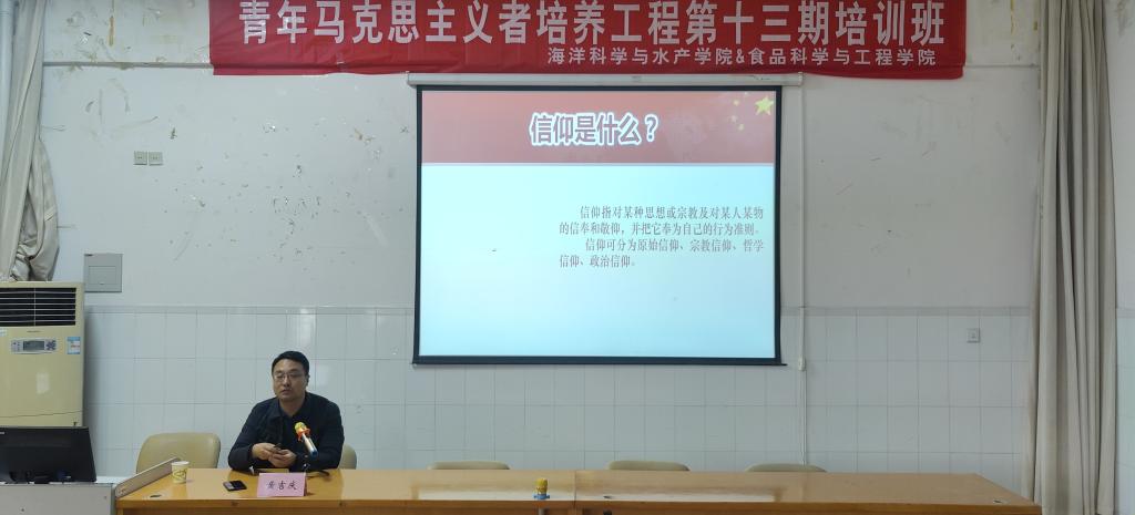 11月28日下午,bevictor伟德第十三期“青马工程”之与青年人谈信仰专题讲座在海洋北楼308室顺利举办。校团委副书记黄吉庆作为主讲嘉宾为海院及食品院全体青马学员讲了一堂生动的思政课。
