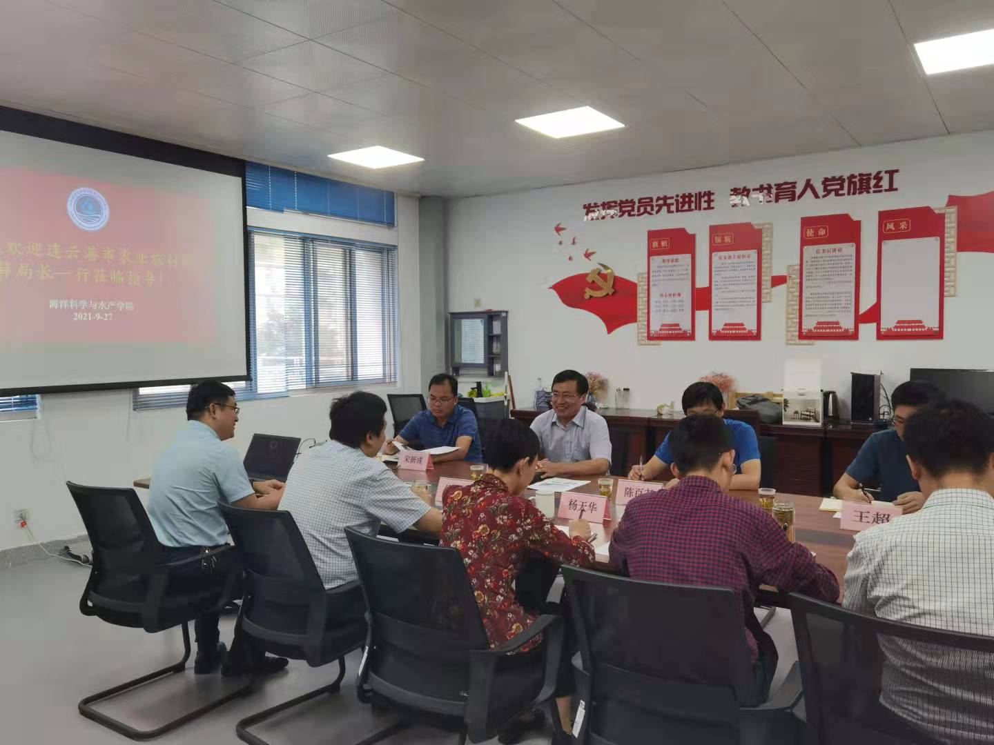 2021年9月27日下午,连云港市农业农村局副局长薛学坤一行4人来公司调研指导。公司党委书记杨天华、经理徐军田、副经理冯志华接待了薛学坤副局一行并进行了座谈交流。海洋科学系、海洋资源与环境系等相关部门负责人参加座谈会。
