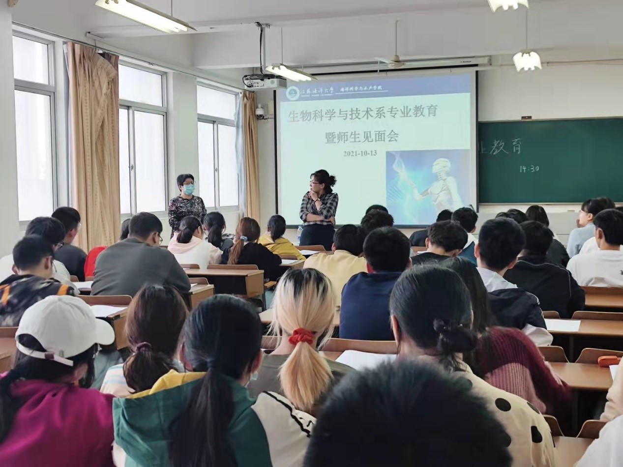 2021年10月13日下午,生物科学系生物技术专业2021级专业教育暨师生见面会在通灌校区明德楼406教室成功召开,生物科学系全部教师和生技专业78名2021级同学出席了本次会议,会议由新生班主任秦蕾副教授主持,公司经理徐军田、副经理高焕和冯志华参会并讲话。
