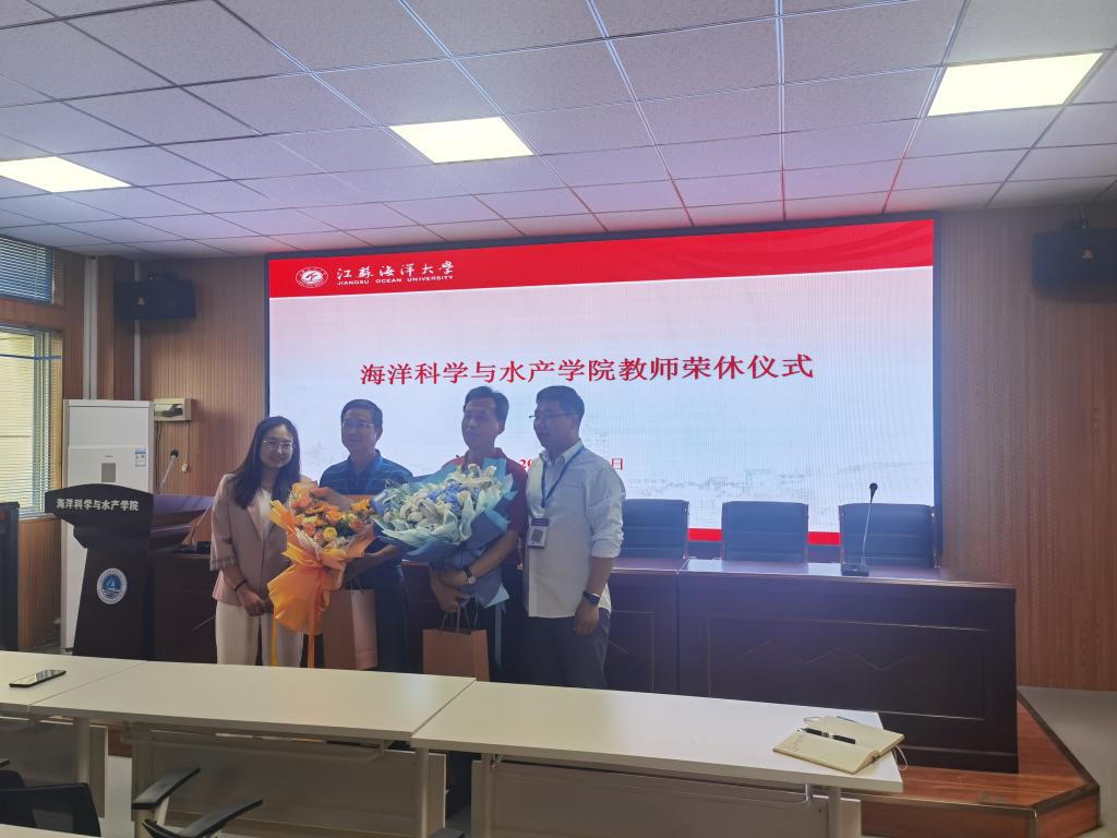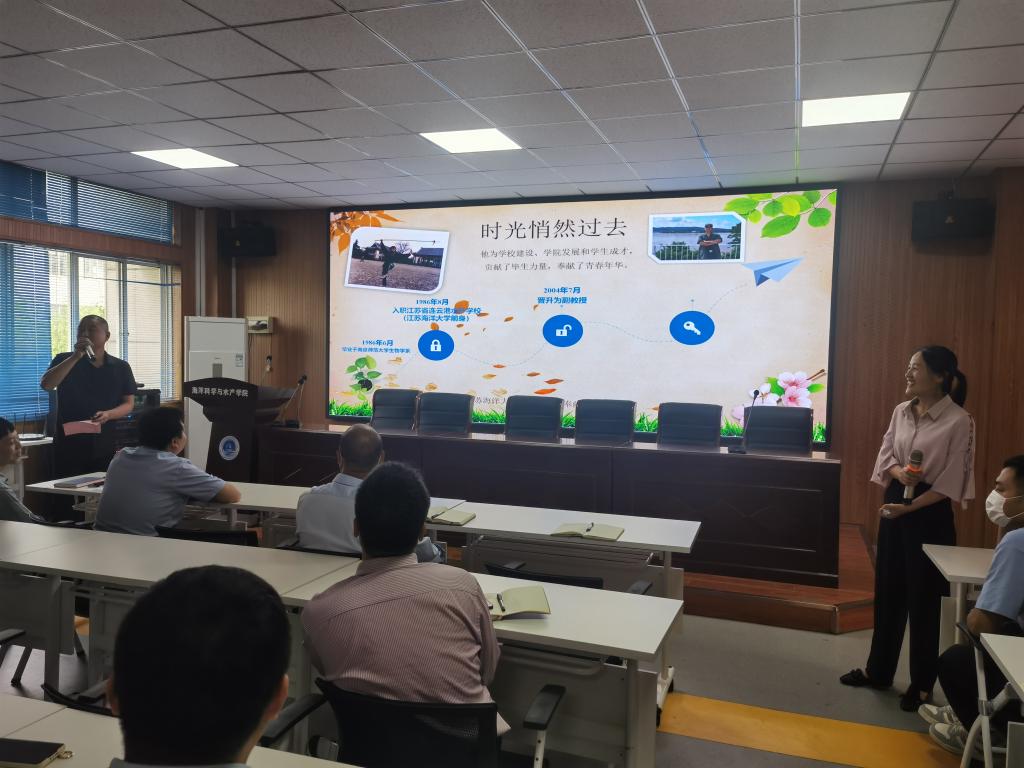 主持人通过PPT带领全体教职工回顾了暴增海教授和吴建新副教授在教学、科研、社会服务、集体活动以及个人生活的方方面面。一幅幅照片、一摞摞成果、一纷纷荣誉,让老师们深深感受到两位老师几十年如一日对教育事业的无私奉献,于平凡之处见伟大,于细微之中显精神,老师们笑着笑着就眼角湿润了…。在热烈的掌声中,院领导和青年教师为两位老师送上了纪念品和鲜花。