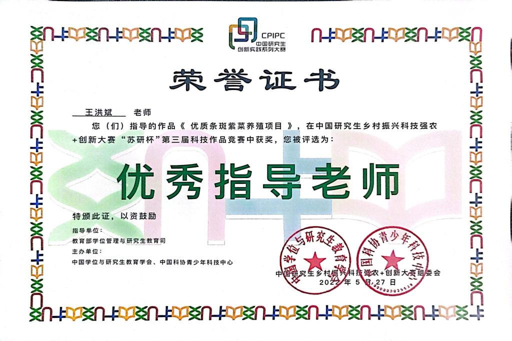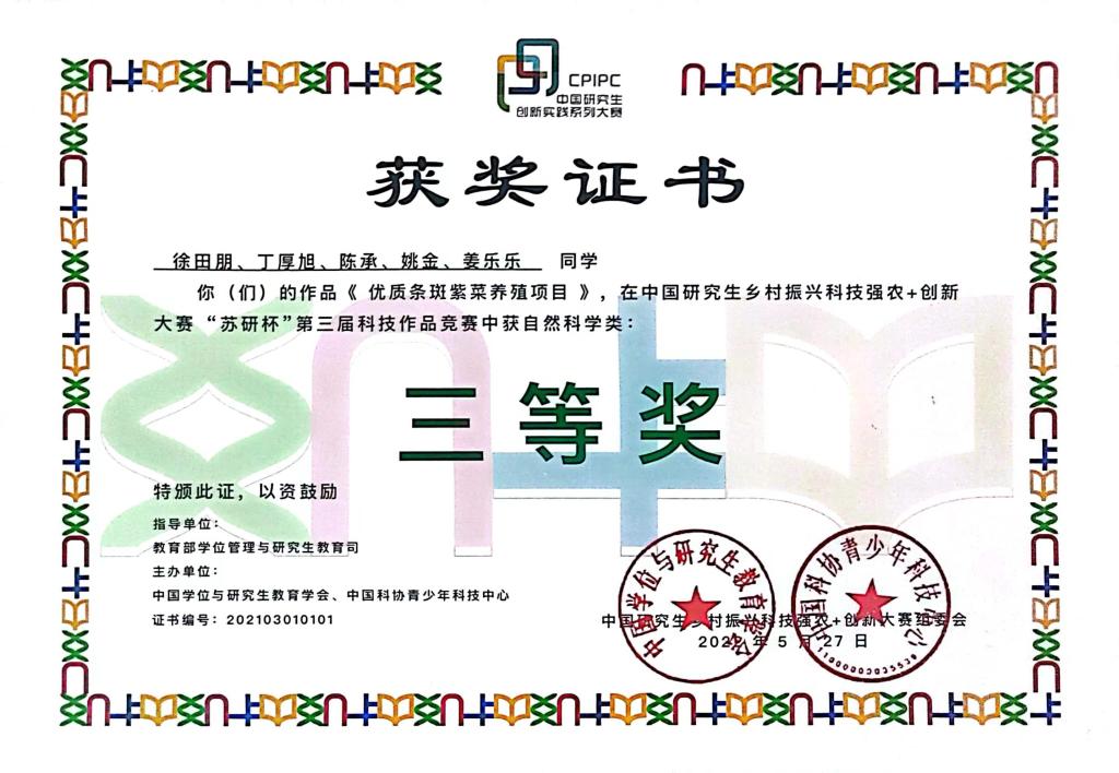 5月20日,中国研究生创新实践系列大赛——乡村振兴科技强农+创新大赛 “苏研杯”第三届科技作品决赛在浙江农林大学举行,公司选送的徐田朋、丁厚旭等同学的作品《优质条斑紫菜养殖项目》荣获三等奖,公司马静副教授、王洪斌教授荣获“优秀指导教师”。