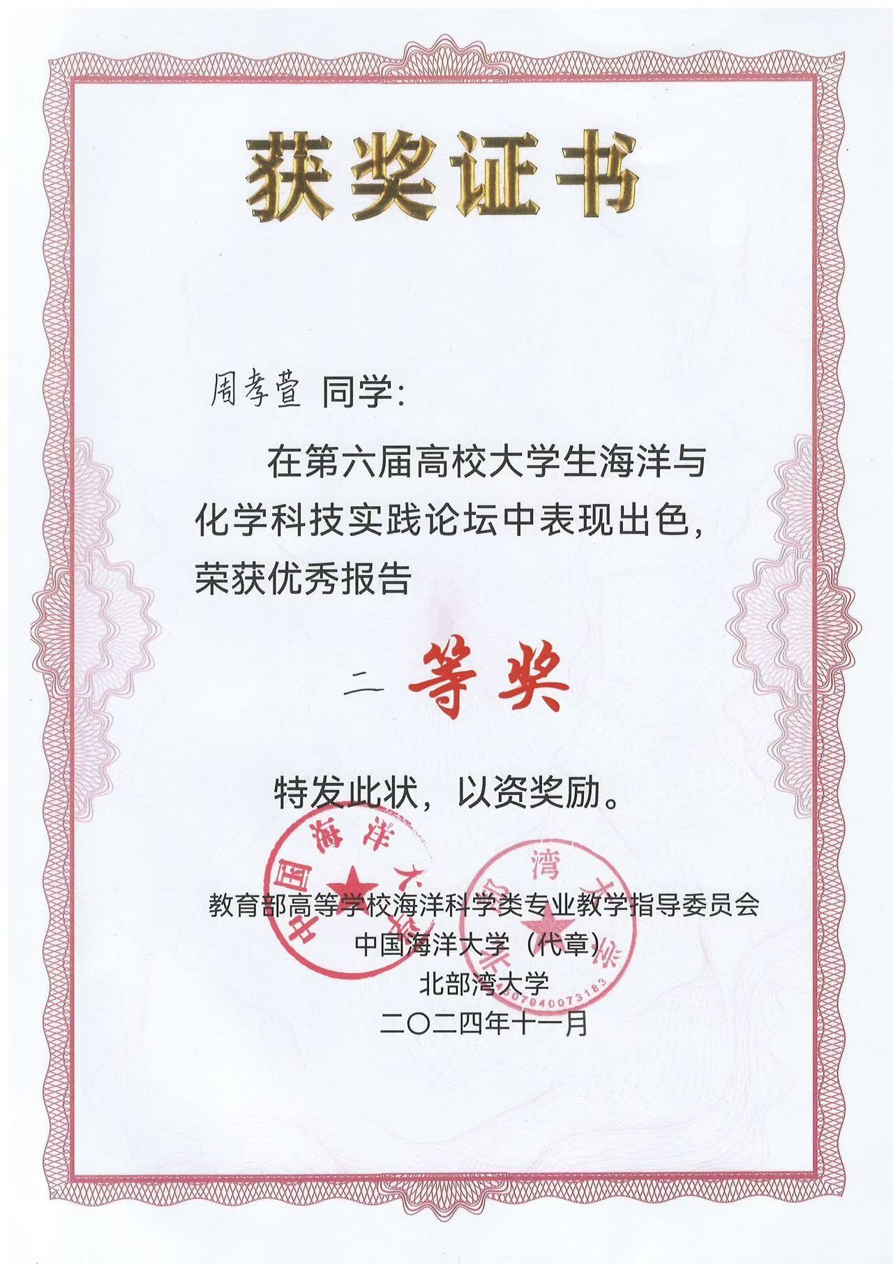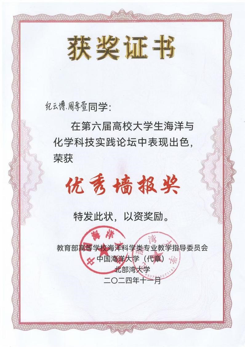 2024年11月14日至15日,第六届高校老员工海洋与化学科技实践论坛在广西北部湾大学举办。公司bevictor伟德杨斌教授带领周孝萱、纪云博两位海洋资源与环境专业大三本科生参加了本次论坛。在杨斌教授团队的精心指导下,周孝萱同学所做的主题报告《茅尾海入海河口区柱状沉积物对磷的吸附行为特征研究》荣获优秀报告二等奖;纪云博、周孝萱同学制作的主题墙报—《茅尾海潮间带表层沉积物铁分布特征及对磷释放的影响》荣获优秀墙报奖。