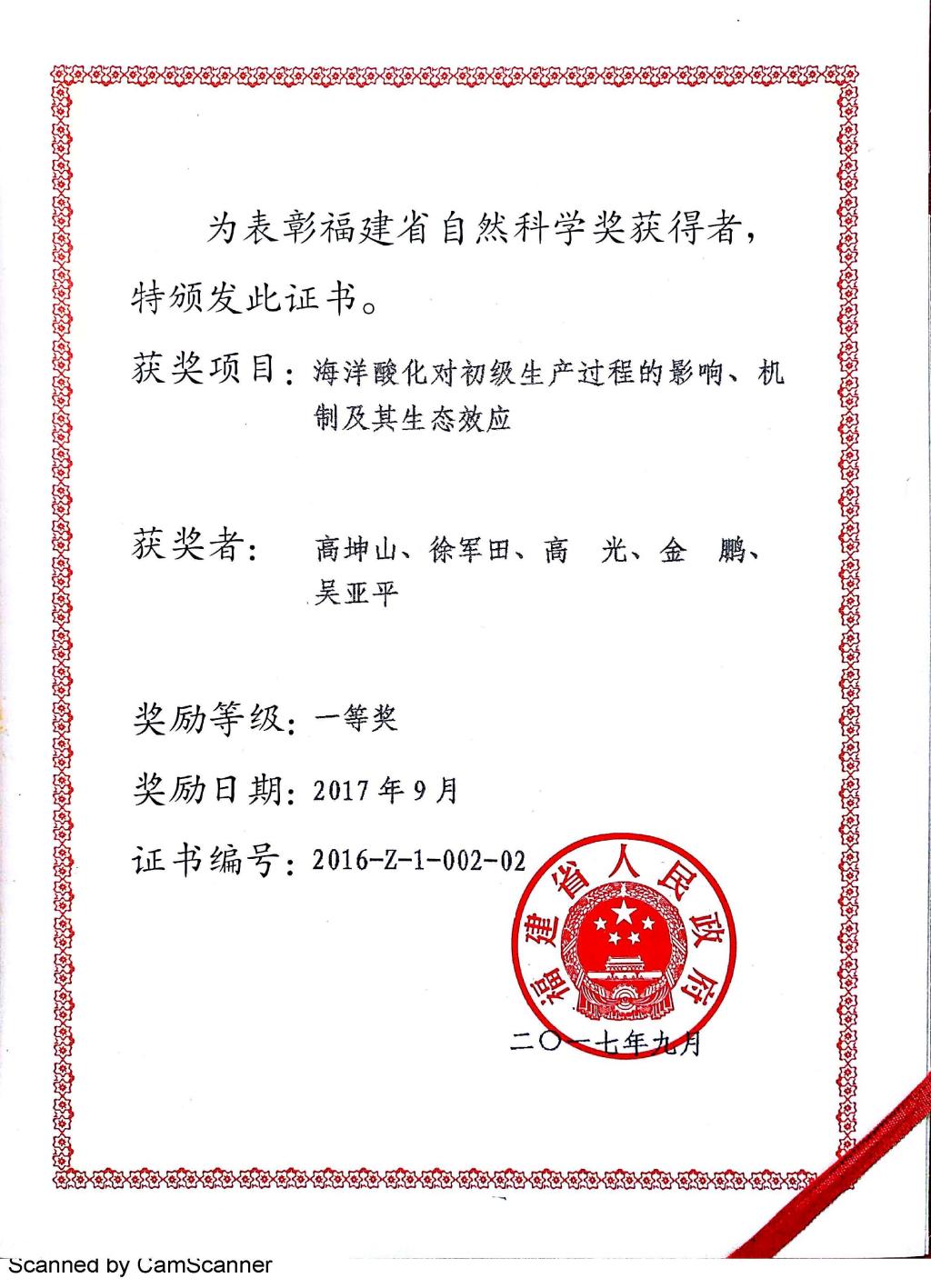 福建省自然科学一等奖