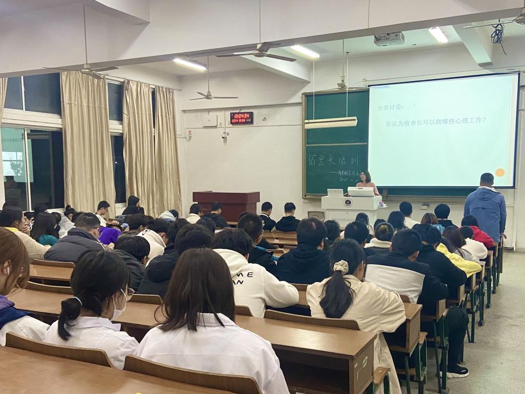 培训分为宿舍长职能和要求的讲解、互动讨论及会后作业几部分组成。培训要求全体宿舍长要明确身份意识和工作职责。善于与宿舍成员沟通,加强报告意识,即对心理脆弱期的舍友做好心理工作,及时上报心理与行为出现异常的同学;并且在面对舍友言语与行为方面的表现时应善于发觉危机状况。