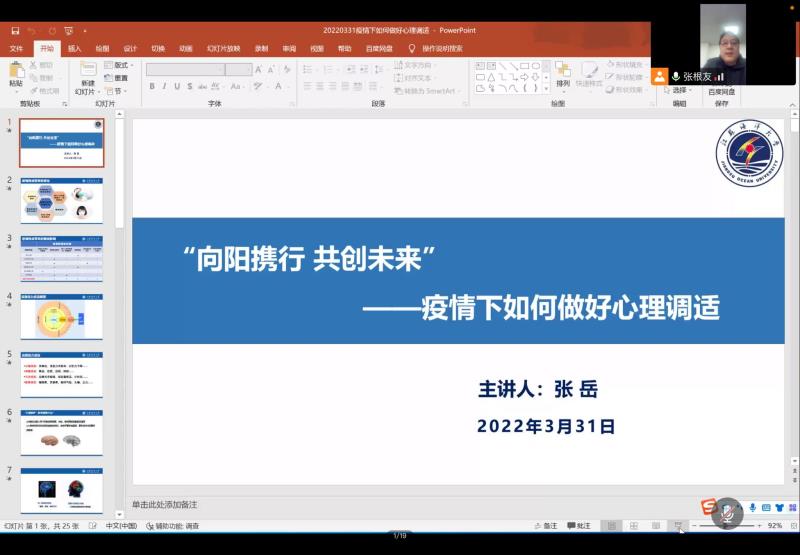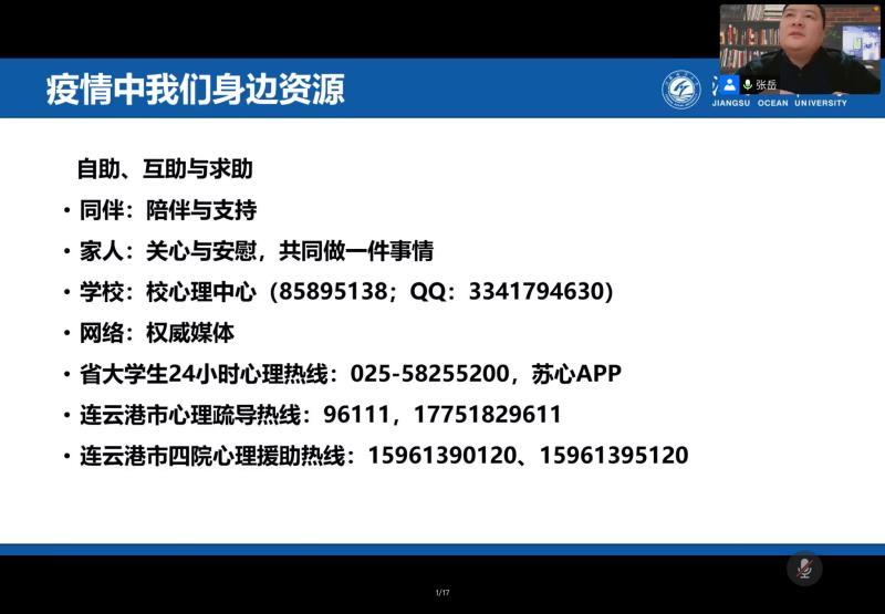 讲座伊始,张岳对讲座各阶段内容进行整体概述,使参会同学了解讲座流程。首先他列出疫情对大家日常生活造成的影响,尤其对毕业生的工作,生活的影响,并提出因疫情所产生的心理焦虑等一系列心理问题都是正常的生理现象,是人类在优胜劣汰中为规避可能对自己造成威胁的人或事所进化出的保护机制。讲座中,张岳给出心理健康标准以用于同学们自测,让同学们能够对自己的心理健康状况进行大致评估。此外,他还针对当前连云港的实际情况给出了诸如心理健康自我管理,保持规律作息,心理咨询专线等切实的心理问题解决方案,为疫情防控期间维护在校员工心理健康指明了方向。