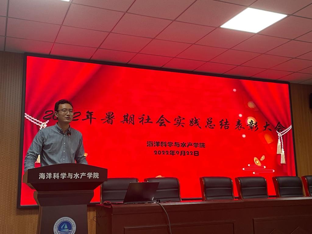 活动伊始,吴子恒向全体人员讲述了社会实践的重要性和参加社会实践活动的必要性。随后各项目负责人依次上台向大家展示项目实施过程、实践成果及社会影响等方面情况。《点藻成‘金’,擦亮‘紫菜之都’特色名片》的项目负责人为大家精彩讲述了探访紫菜基地、有害藻琼脂提取实验等活动的过程。《封存水生世界,助力乡村振兴》的团队负责人重点从实践成果方面汇报了项目,介绍了其培养员工对水产养殖兴趣的实践目的。《科普海洋知识,增强爱海意识》项目负责人介绍了活动背景,强调了希望青年员工要增强国土安全意识和海洋保护意识,表达了对时代新青年学海、知海、爱海的期盼。六个团队依次展示完毕后,评委们对他们的项目进行打分,最终《技术服务惠民增产增收,科技兴渔助力乡村振兴》、《构筑防疫堡垒,关爱弱势群体》、《封存水生世界,助力乡村振兴》三个实践团队获得优秀团队,朱小明为获奖的团队进行颁奖。活动最后,唐振新对本次暑期社会实践总结会进行小结。