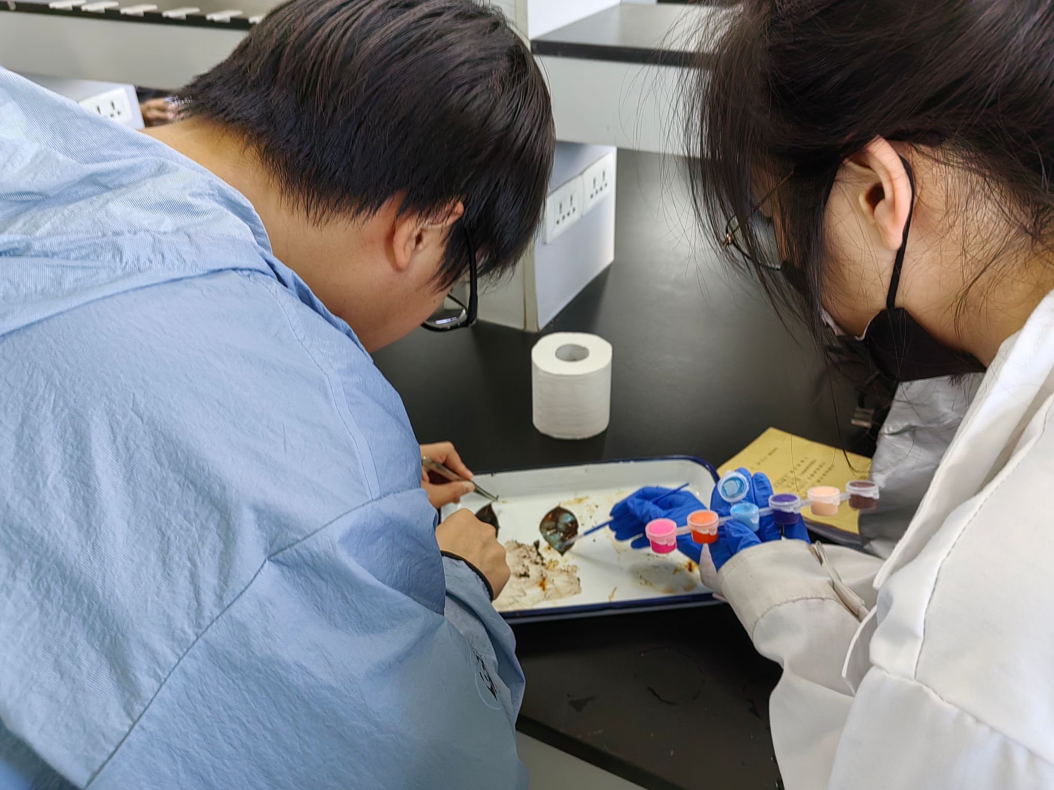 活动现场,工作人员为参赛者讲述制作书签的过程——主要分为四步:首当其要是选好叶脉粗壮而密的树叶;然后是用5%的氢氧化钠溶液煮叶片;第三步是刷掉叶肉留下叶脉;最后是晾干染色美化后塑封。工作人员同时强调了实验室仪器的注意事项,随后比赛正式开始。