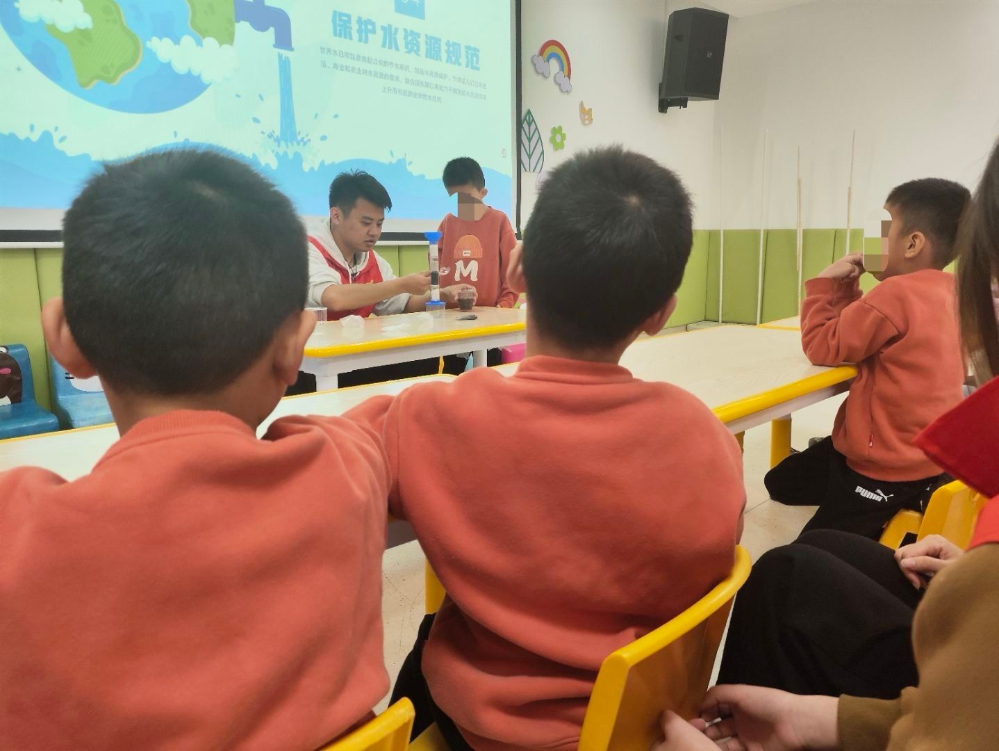 活动现场,志愿者们通过生动有趣的图片和视频,向孩子们讲解了水资源的宝贵性和节水的重要性,并用简单易懂的方式介绍了水的循环、节水小常识等。为了让孩子们更直观地了解节水知识,志愿者们还精心设计了多个简单易操作的节水小实验。志愿者王璠向小朋友们演示了水的过滤实验,通过将浑浊的污水依次倒入装有滤纸、石英砂和活性炭的过滤装置,污水逐渐变得清澈透明,孩子们亲眼见证了科学的神奇力量,发出阵阵惊叹,也更加理解了洁净水的来之不易。