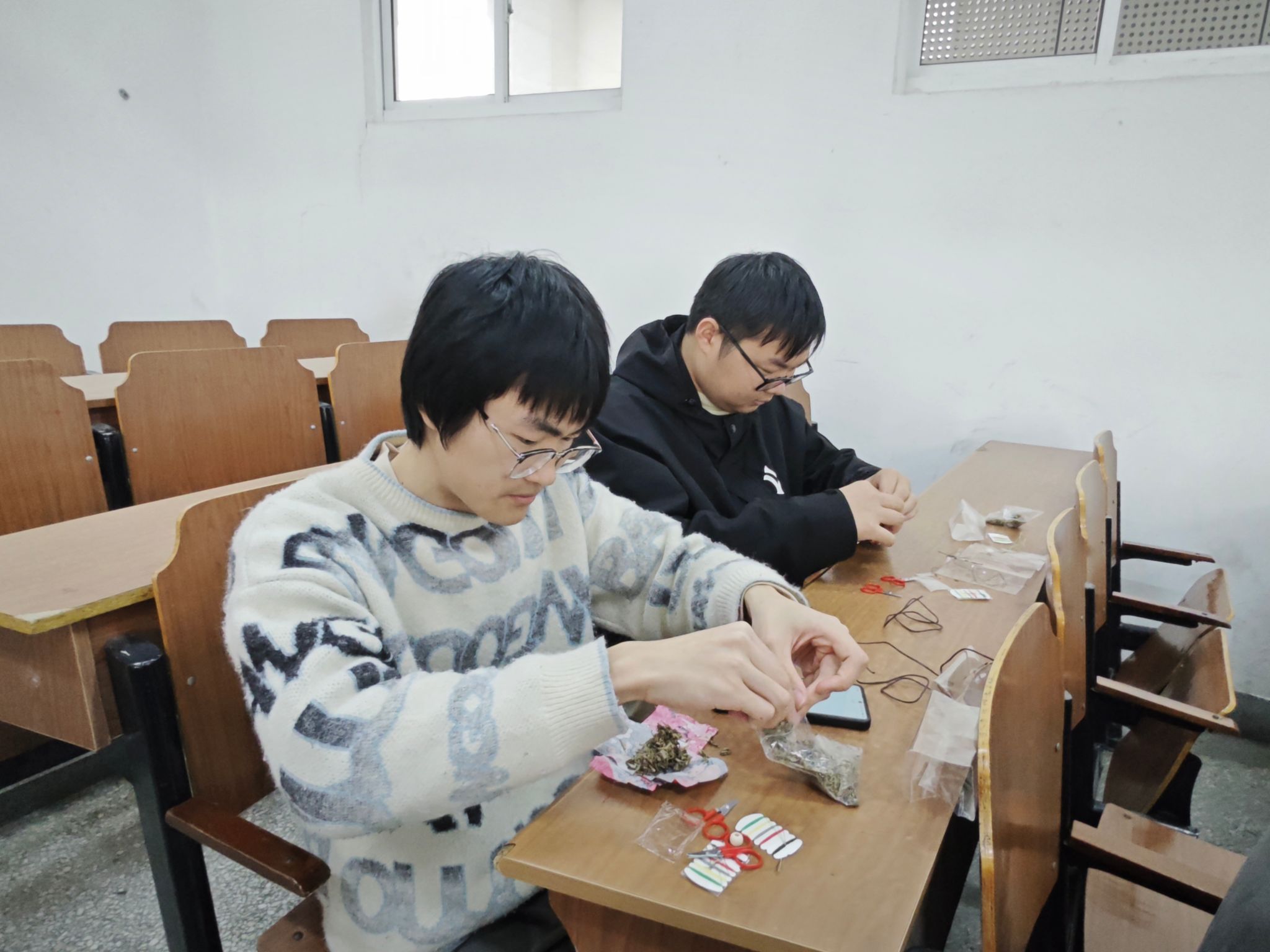 在实践环节,工作人员为参与者分发了精心准备的制作材料,包括彩色布料、丝线、填充棉及多种中药材。同学们热情投入制作过程:从布料裁剪到针线缝制,从香料填充到收口装饰,每一个步骤都凝聚着大家的巧思与匠心。活动现场交流互动频繁,传统手工艺的独特魅力在欢声笑语中得到传承。