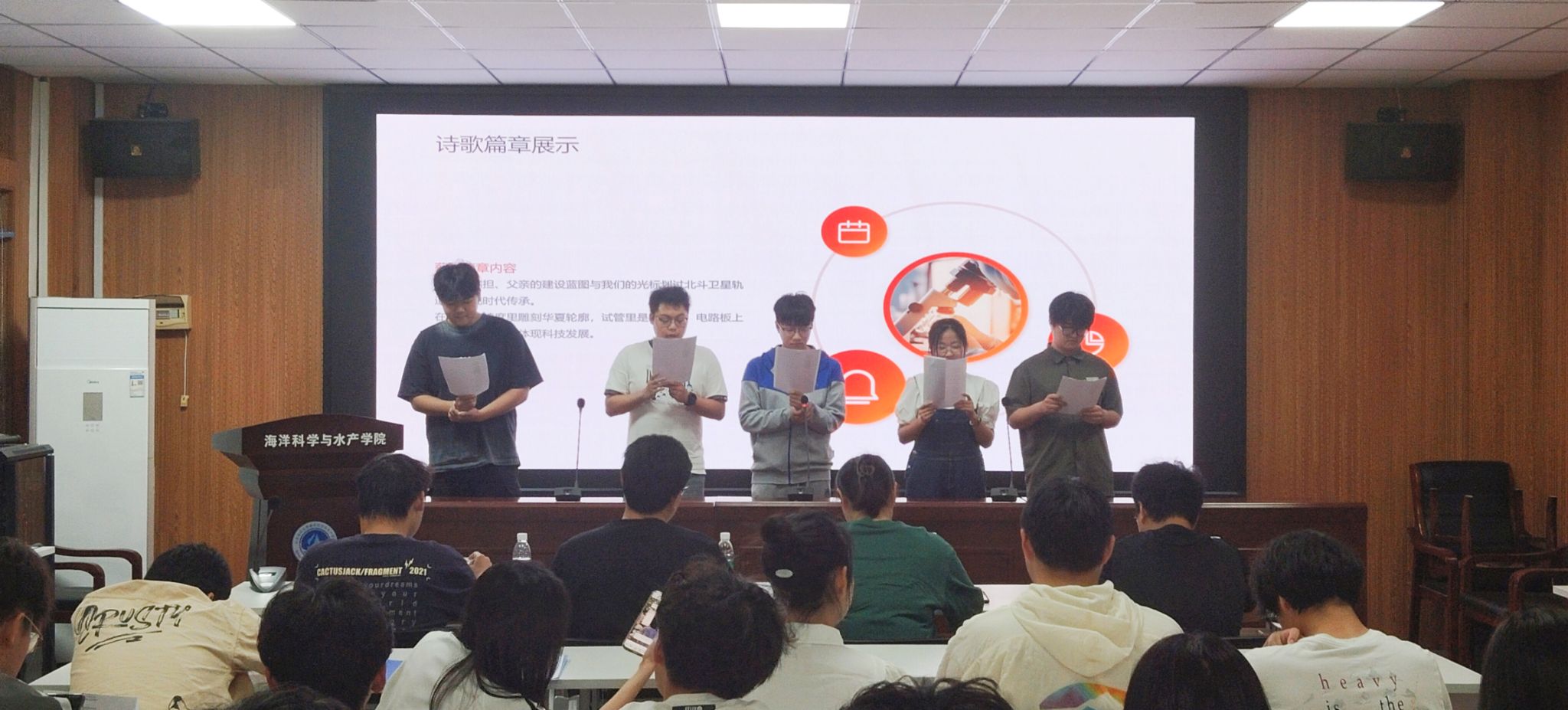 活动现场,各参赛班级依次呈现精心编排的朗诵作品。生技1242班演绎的《青春铸剑》以跌宕起伏的旋律为背景,朗诵者们声情并茂的表演将诗歌中激荡的爱国热情与深沉的时代担当展现得淋漓尽致。海科1241班带来的《青春华章映山河》通过铿锵有力的诵读、默契的声部配合,以金石掷地般的韵律引发观众强烈共鸣,将现场气氛推向高潮。经过激烈角逐,比赛最终评选出一、二、三等奖。