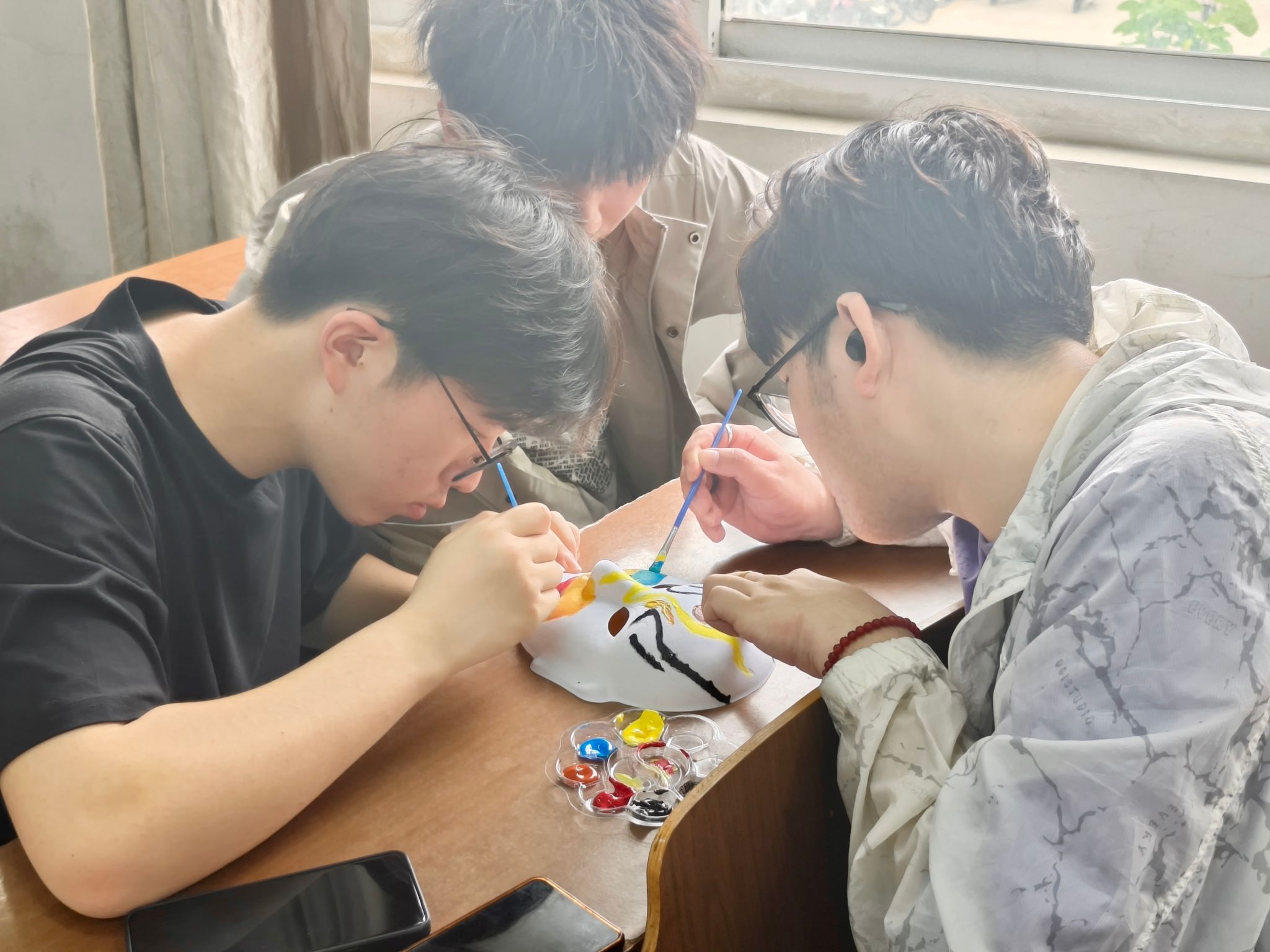 创作环节中,同学们全神贯注伏案勾勒,画笔蘸取颜料的细微声响与纸面摩擦的沙沙声交织。有人反复调整图案布局,有人则直接以颜料大胆填色,以浓烈的大红色奠定面具主色调,再用黑色勾勒,用渐变的蓝紫色表现脸谱的神秘感。所有同学都沉浸在自己的世界里,用心创作着心目中最美的脸谱,每个人都在用心去感受传统文化所带来的魅力,用行动书写对艺术的理解和对文化传承的实践。淡黄色颜料如月光流淌,顺着面具的弧度晕染出朦胧的光晕;深蓝色颜料被刻意刮擦,形成斑驳肌理,似古老城墙的岁月痕迹,传统戏曲元素与现代艺术表现手法在方寸面具上交相辉映。