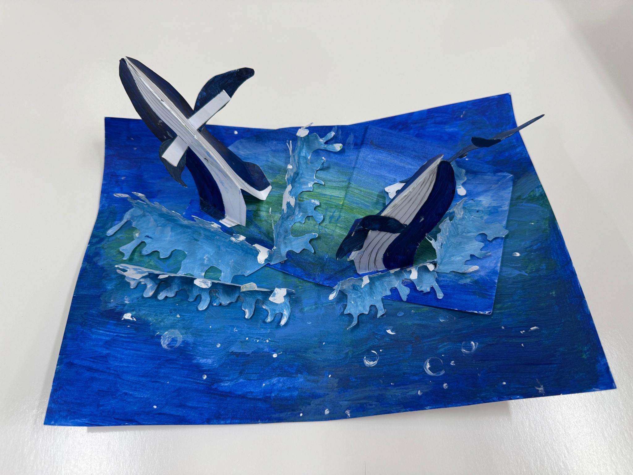 活动现场,主办方为参与者提供了丰富多样的材料,包括彩色卡纸、剪刀、胶水、各类海洋生物图案素材等。大家将普通的卡片裁剪、折叠、拼接,逐步构建出立体海洋场景——从灵动的小鱼、可爱的海星到庞大的鲸鱼,各类海洋生物栩栩如生,共同组成奇幻的立体画卷。