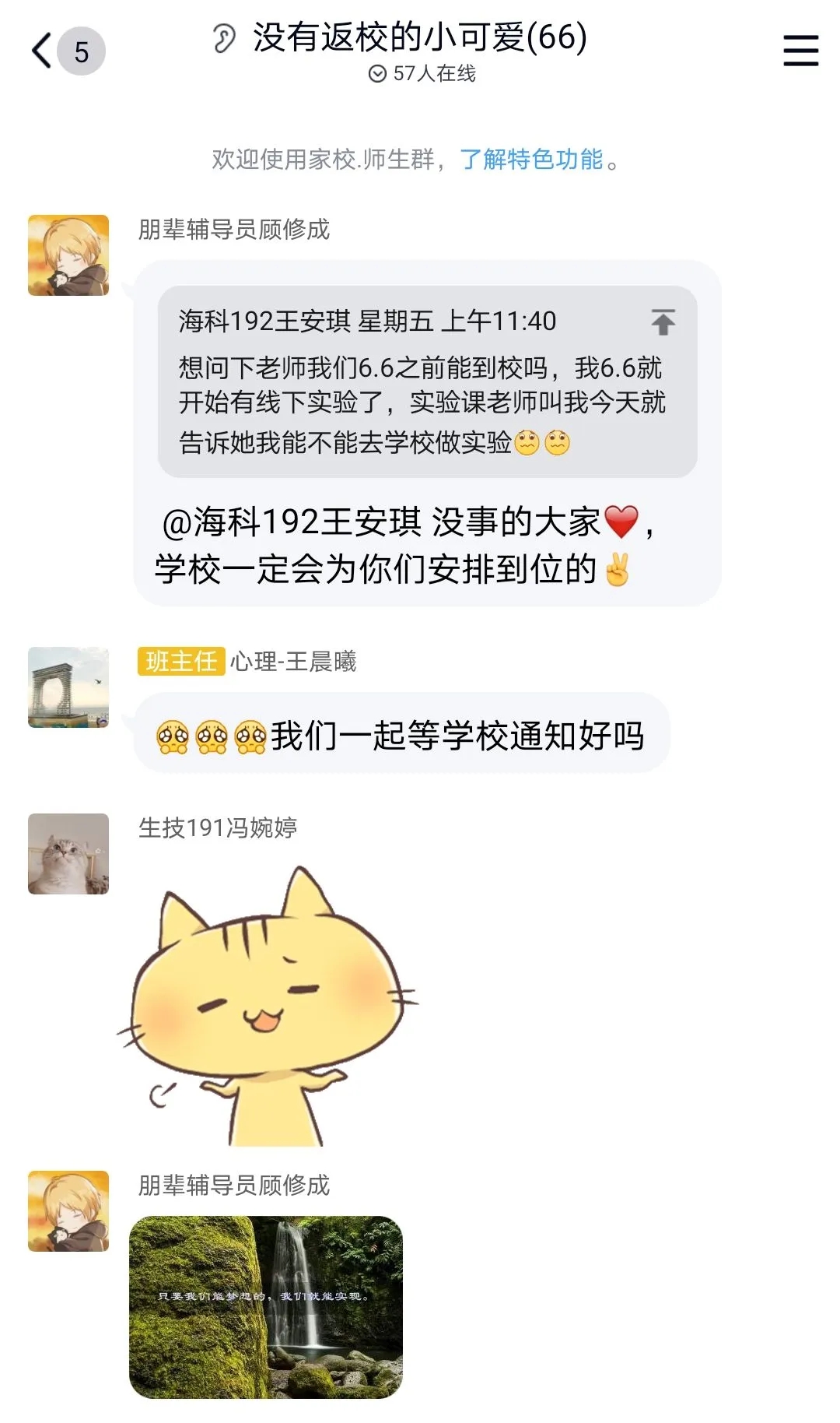 海院老师还会定期打电话回访没有返校的同学,询问他们最近的状态,了解他们在家的学习生活情况,鼓励他们不要过于焦虑,保持好的心态。老师们细致周到的工作让未返校的同学即使在家也能实时接收到公司里的消息,使得他们对校园内的点点滴滴有了更强的参与感,也真切感受到来自公司的关心,能够以更加良好:的状态进行每天的学习生活。愿疫情早早过去,愿每个同学每天都可以快快乐乐。