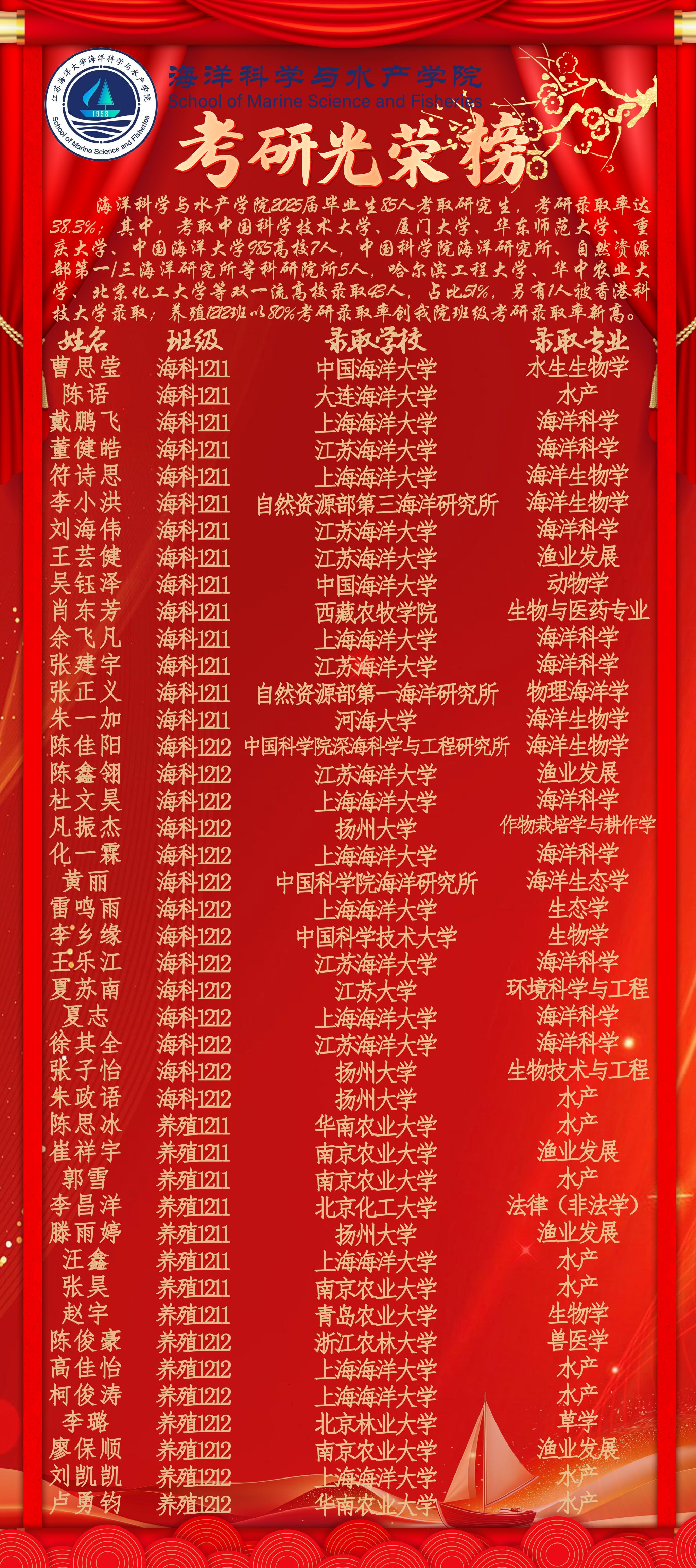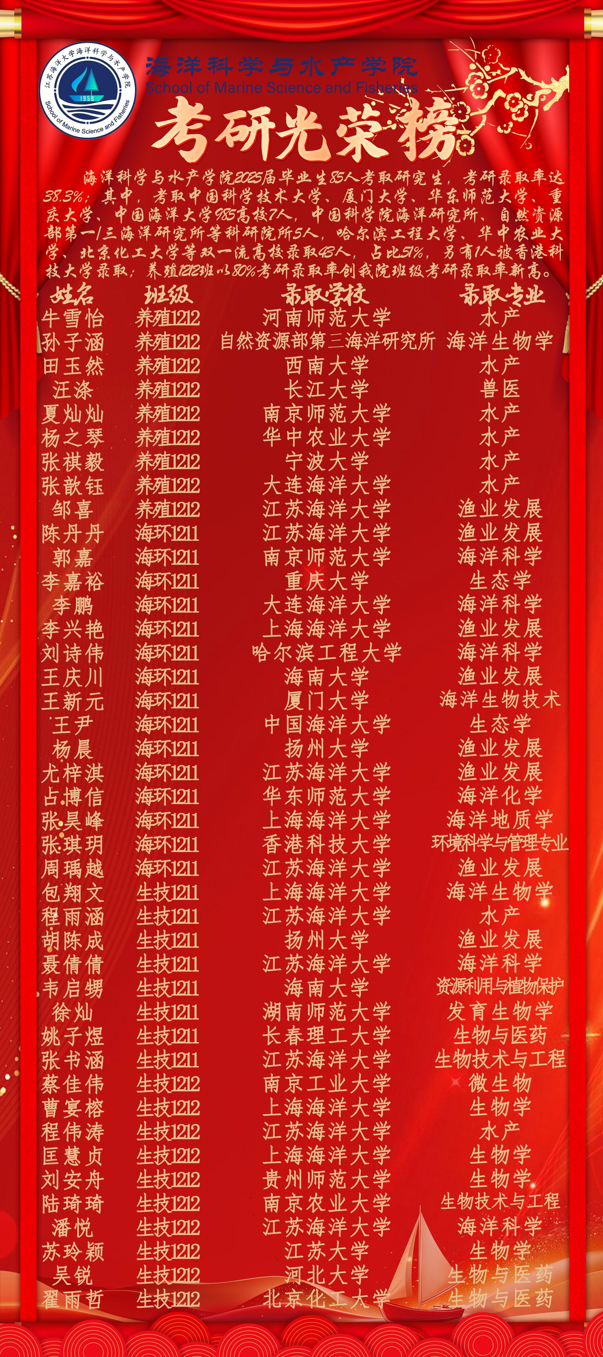 bevictor伟德2025届毕业生85人考取研究生,考研录取率达38.3%;其中,考取中国科学技术大学、厦门大学、华东师范大学、重庆大学、中国海洋大学985高校7人,中国科公司海洋研究所、自然资源部第一/三海洋研究所等科研院所5人,哈尔滨工程大学、华中农业大学、北京化工大学等双一流高校录取43人,占比51%,另有1人被香港科技大学录取;养殖1212班以80%考研录取率创公司班级考研录取率新高。