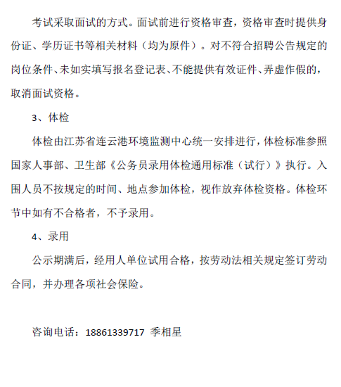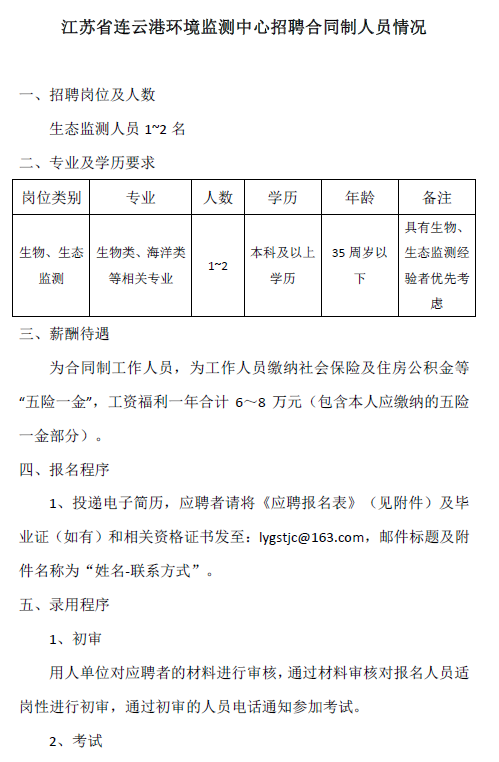 江苏省连云港环境监测中心生态监测科招聘合同制人员情况